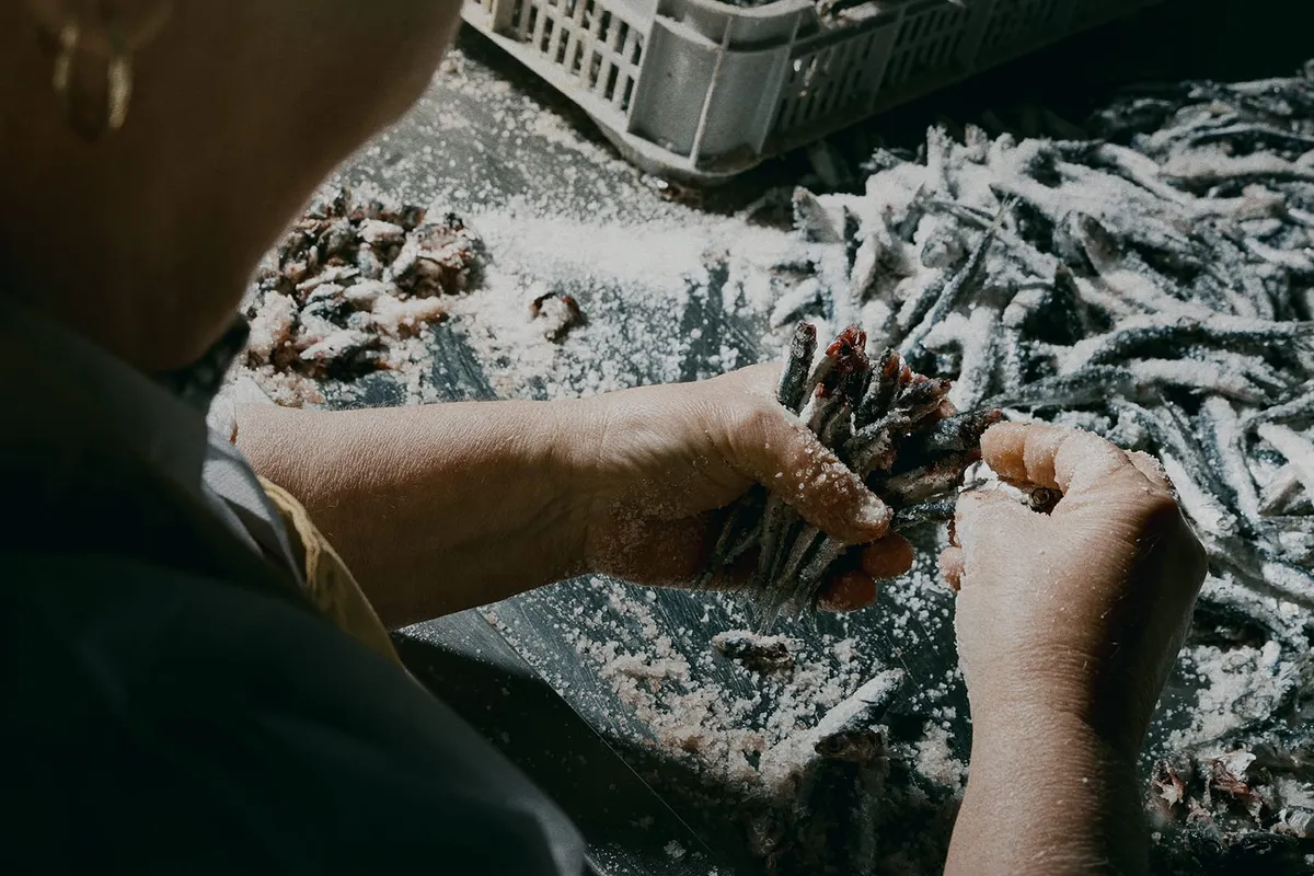 마을 여성들의 숙련된 손길로 머리와 내장을 제거하는 '스케파차투라' 과정을 거칩니다. 모든 공정이 수작업으로 이루어집니다.